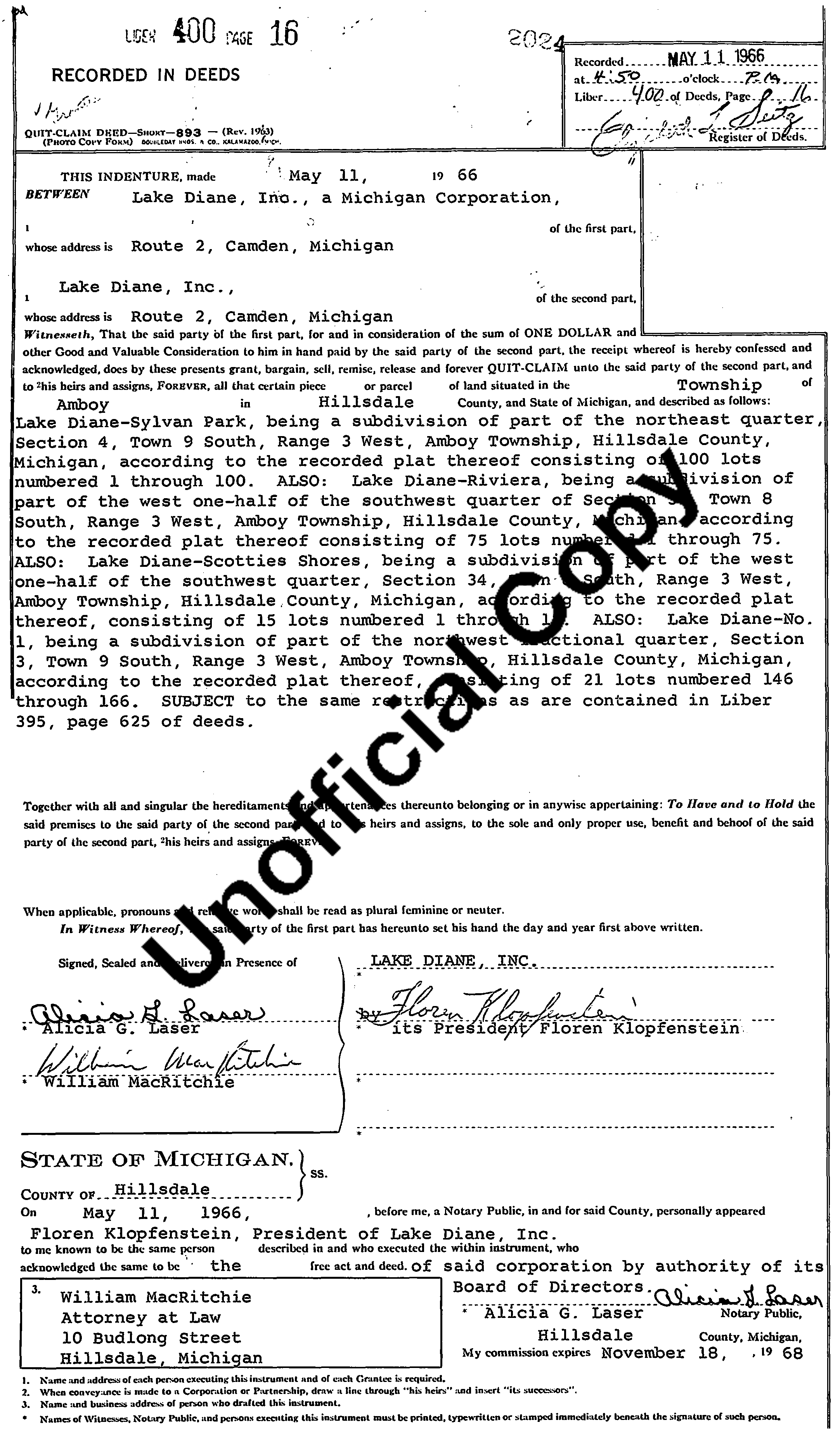 Deed Restrictions: Covenants that govern how land/property can be used outside of municipal, state, and federal ordinances and laws. These by law should have been provided for you as part of your real estate purchase from the seller and/or real estate agent(s) involved. For your connivence, the LDCA board has gathered these for education and awareness of our members and those of the community. The information is as recorded with the County of Hillsdale and LDCA is not the governing body nor legal enforcement of the information below. Information below is provided to assist in the education of the members of the community, for which we suggest doing additional research and legal review before making and decisions or actions.