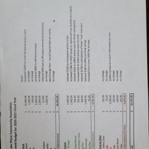 The Proposed Budget for 2020-2021 Fiscal Year was presented. Kim Byrne made a motion that the (attached) proposed budget be approved. Jerry Agrusa seconded the motion. A vote was taken, and the motion passed unanimously.
